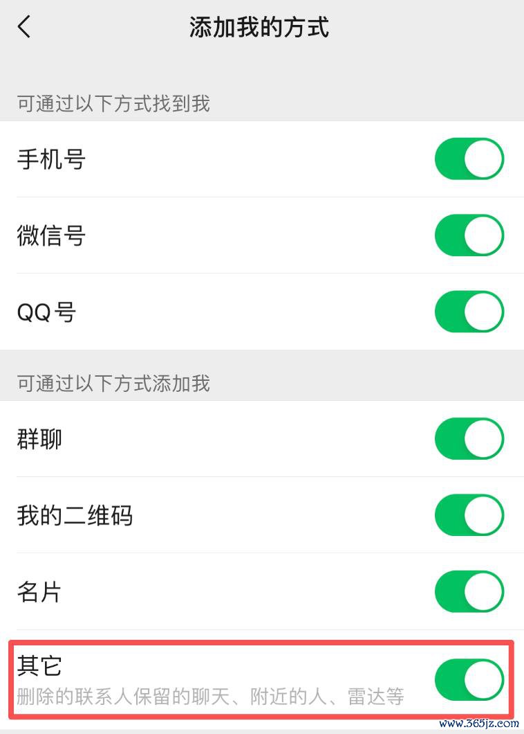 在建立-一又友权限-添加我的方式,刻下底部多了一个其他的选项,关闭该功能后,那些“删除的讨论东说念主保留的聊天”的好友,以及隔壁的东说念主、雷达皆不成通过这些方式添加你为好友。